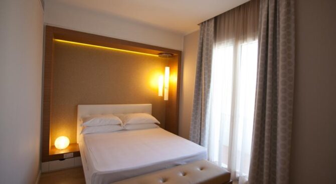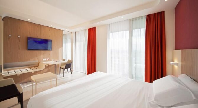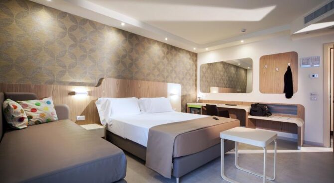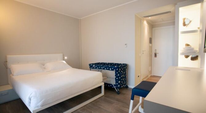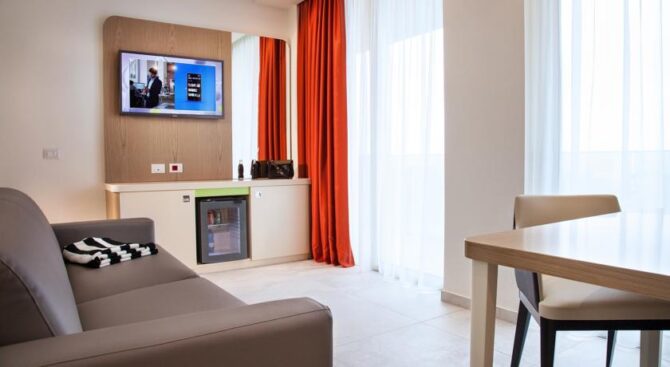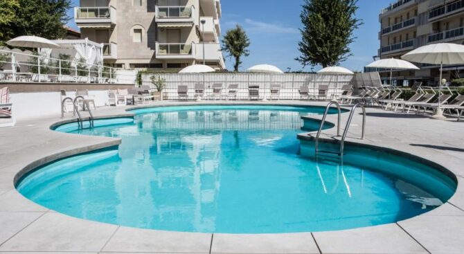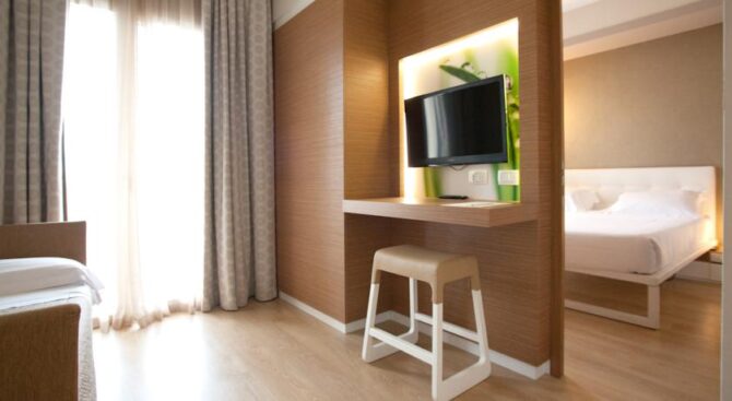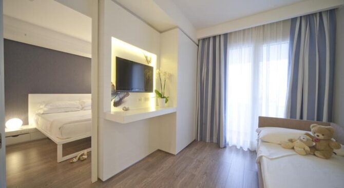 Excellent resort hotel for a comfortable family holiday. It is located next to the beach in the Viserbella area within walking distance of the train station. Spacious rooms with comfortable modern furnishings, air conditioning, a large TV panel and a private balcony with panoramic views of the Adriatic Sea are provided.