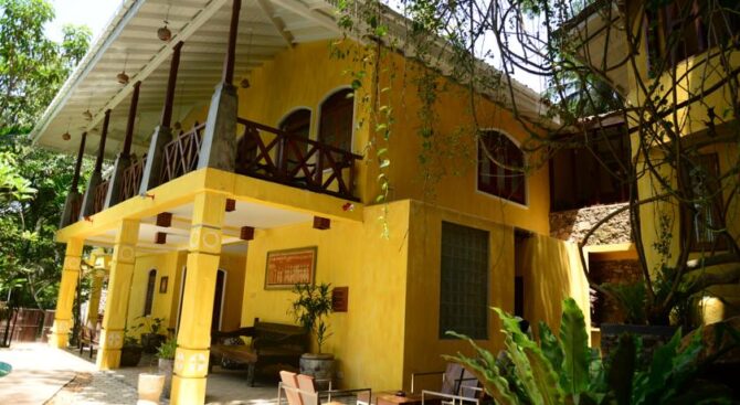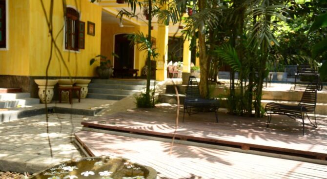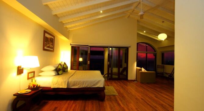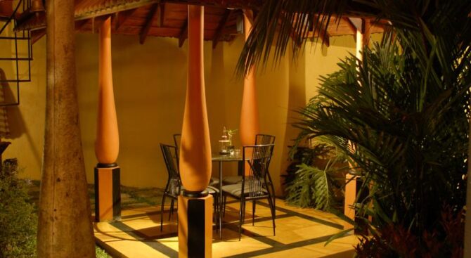 The hotel’s spa offers ancient Ayurvedic treatments using natural herbal cosmetics. There is a place for yoga, own library. The 22 rooms of the hotel have bathrooms, four-poster beds, fan, balcony overlooking the jungle. Babysitting services are available on request.