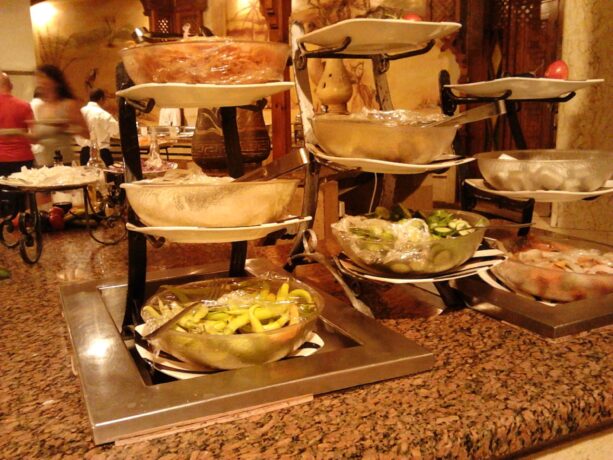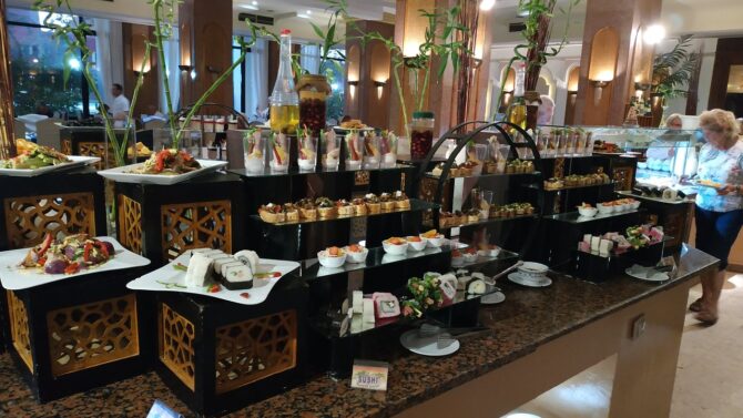 The buffet is open in three restaurants. The main one is located on the first floor of the main building, it offers dishes of international cuisines. The second is located on the terrace – eastern, and the third is also international cuisine. In addition to them, there is a bar with snacks: salads, ice cream at lunchtime, pizza, sandwiches, and so on. Approximately the same menu in the other 4 bars.