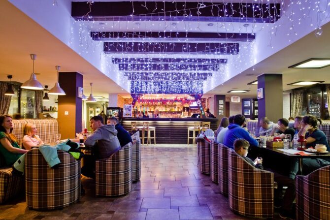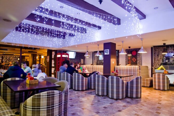 Guests can prepare their own meals. For this purpose, a common kitchen with all necessary appliances and a set of dishes is equipped. For lovers of noisy dinners or hangover breakfasts, The Days Bar is located in the hostel building. Guests and guests of the resort are offered set breakfasts at a fixed price. During the day, you can relax from skiing, and in the evening you can fall into a noisy company and have a snack before visiting the nightclub.