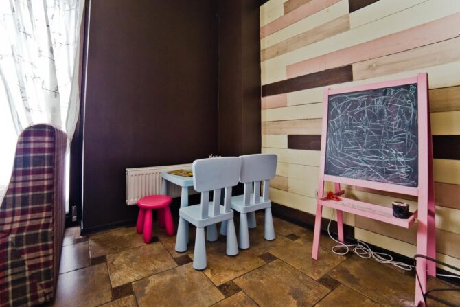 This is due to the fact that leisure and service are designed for adults. And it’s also the politics of the hotel complex. For holidays with children, it is better to consider other hotels where conditions are created for their restful sleep, food and games. At the same time, the owners went to meet their regular guests and arranged a small playground in the yard with a slide, swings and a sandbox. In the café there is a children’s corner with a small table, chairs, a drawing board.