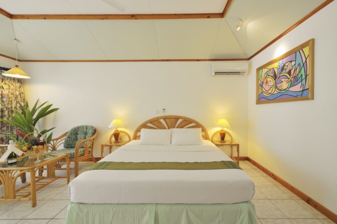 Another thing is the super bungalow on the shore and Sunset Villa. Each room is equipped with two entrances, there is a huge double bed, furniture on the terrace and in a make-up living room. As in previous cases, tourists who do not bring slippers and a bathrobe will have to buy them in one of the local stores.