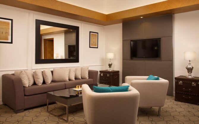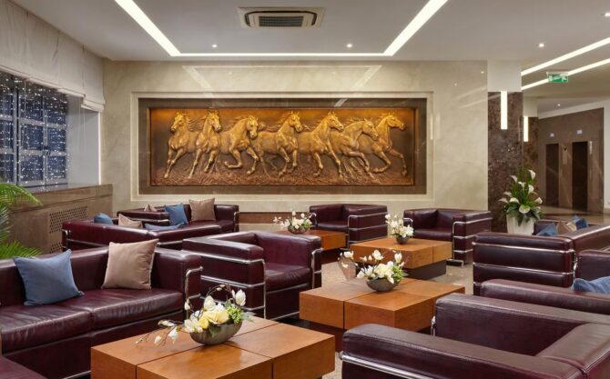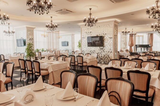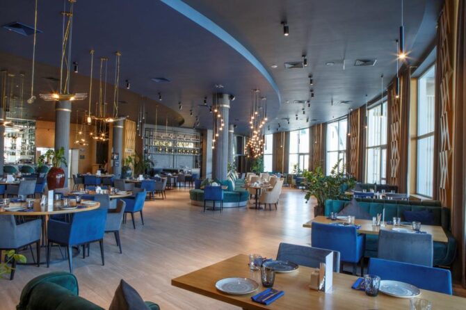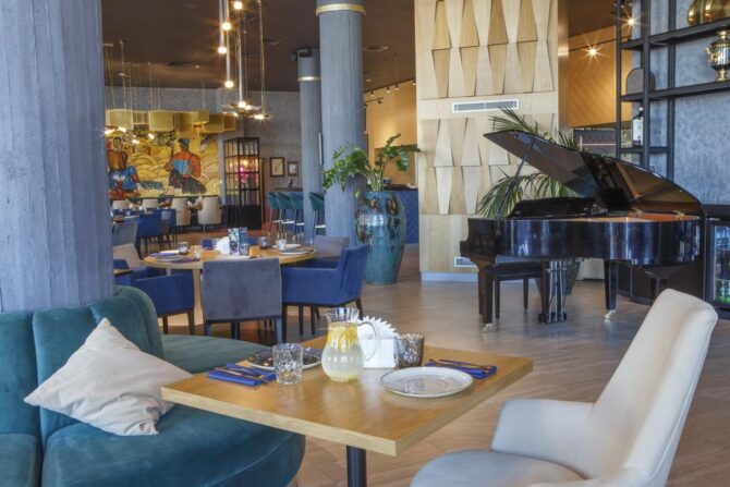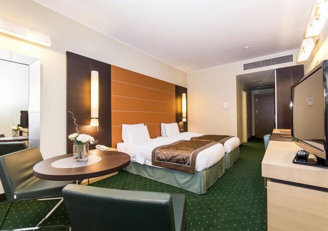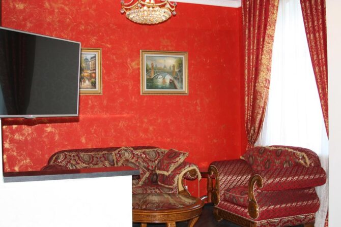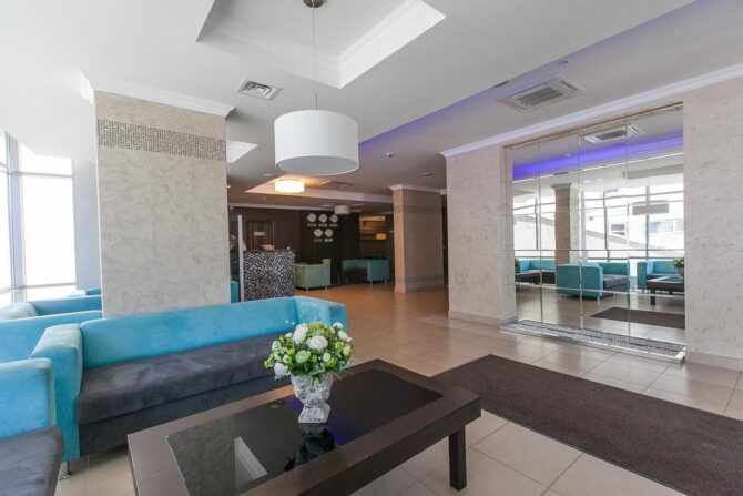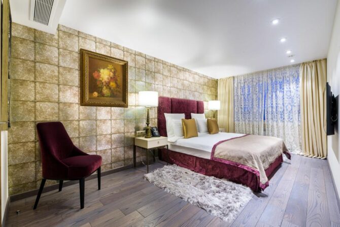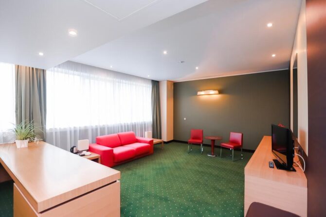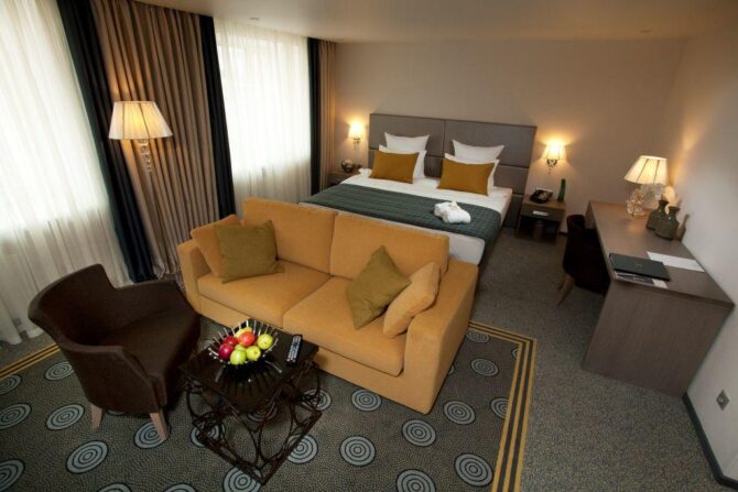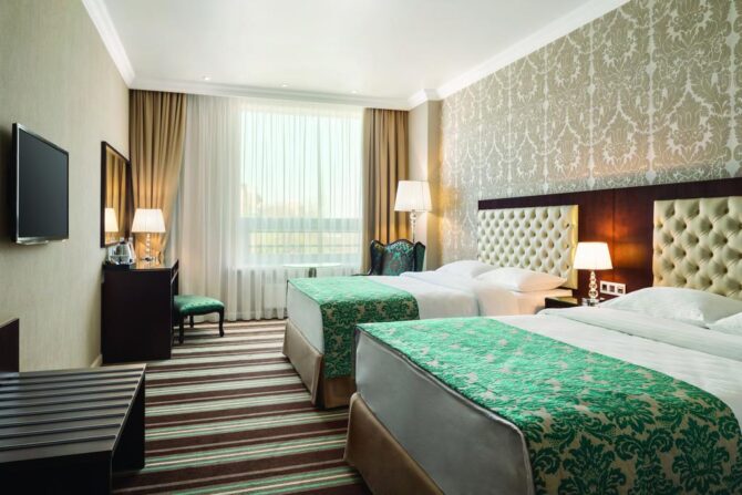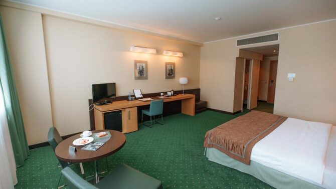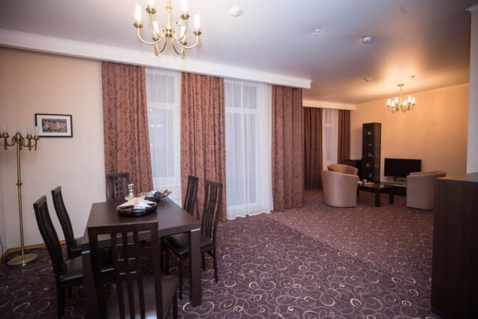 The modern hotel complex belongs to the category of 5 stars. It is the city center and a great starting point for exploring the local attractions. Travelers and business people valued the level of comfort and location by 9 points out of 10 possible. For leisure activities there is a fitness room, a swimming pool, a sauna, a massage room. The business centre provides secretarial, simultaneous and translation services. To accommodate guests are offered rooms of the following classes: deluxe, business suite, studio, executive suite, presidential suite, apartments. On the territory there is a restaurant “Milli” and a bar “Pivovar”. Breakfast is buffet style.