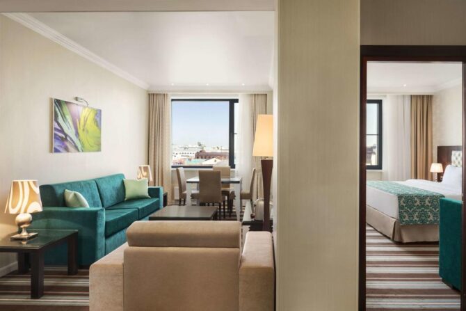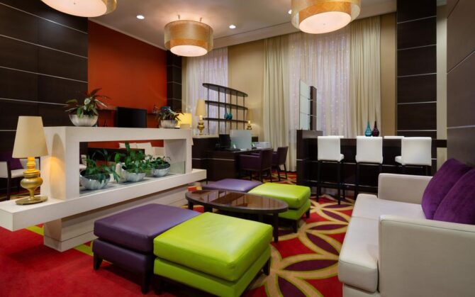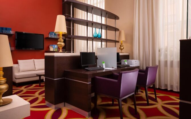 The hotel is marked with 4 stars and belongs to the American network brand Ramada. To accommodate guests there are rooms of the first and highest category, suites, including presidential, rooms for people with disabilities, there are several rooms for living with pets. Also at the service: fitness center, test drive for Mercedes cars and car service, laundry / dry cleaning, transfer (around the clock). Breakfast is served at The Americano Restaurant. The lobby bar and restaurant are open around the clock. Business lunches, lunches and dinners are available à la carte. For children, a separate menu has been developed taking into account their tastes.