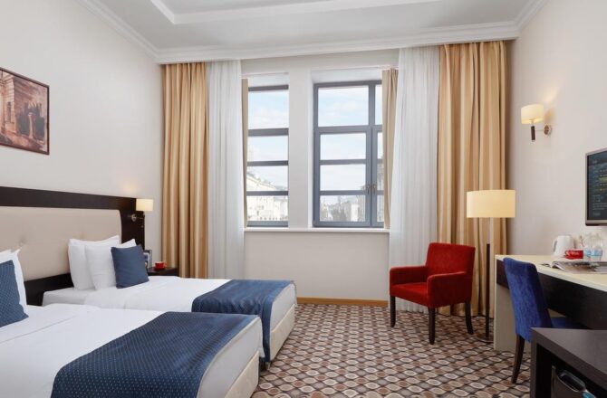 4-star hotel in the center of Kazan (100 meters from the metro station “Kremlin”) has long attracted representatives of business structures. It accommodates business partners during business trips or transit flights. Kazan International Airport is 24 km away. Comfortable accommodation is provided by cozy single and double rooms,a free fitness center and a panoramic terrace on the roof of the building with its own grill restaurant. It overlooks the historic center of the city and the famous Kazan Kremlin. Breakfast is served buffet style in both of the hotel’s restaurants. There is a rate without breakfast. Safes are available in each room to store important documents and personal valuables.