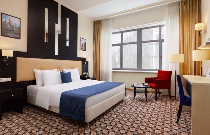 The three-star hotel is located in the heart of Kazan. From here it is easy to reach any point of the city and the airport. In the number of rooms: standards, apartments, rooms for people with limited mobility, deluxe, junior suite and family rooms. There is an on-site restaurant serving a Swedish breakfast in the dining room, and a Bliss bar with a good cocktail list. Spa and gym facilities are also available. For younger guests there is a games room, a special children’s menu with a discount of up to 50%, a crib, a potty and a bathrobe. Families are provided with rooms with connecting rooms and an equipped kitchen. The hotel constantly holds promotions, providing guests with discounts on certain services.