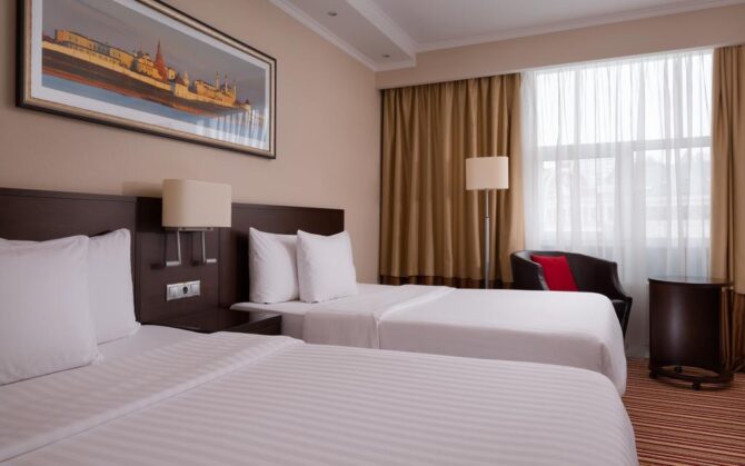 The 4-star hotel is located in the heart of Kazan. It belongs to the Doubletree by Hilton network. The rooms can accommodate from 1 to 4 people. The most comfortable are deluxe and suites. There are special rooms with connecting rooms for families with children. All the proposed hotels located within the city are located within walking distance from the metro stations. From Hilton to the “Kremlin” 5 minutes walk. For lovers of outdoor activities, a fitness room is available. Restaurant “Kedr” specializes in American, Tatar and European cuisine. Breakfast is served in the morning. The lobby bar serves light snacks and drinks.