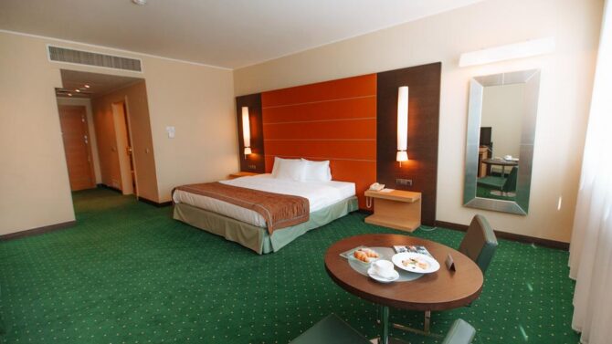 All the proposed hotels are located at the intersection of roads leading to Kazan International Airport. Travel time is from 20 to 35 minutes. If you have to fly in transit with children, it is best to pay attention to the hotel “Nogai”. It provides not only family rooms, but also a play area, accessories for the child and a children’s menu. Children under 5 years old stay and eat free of charge, up to 12 years old get a 50% discount for breakfast.