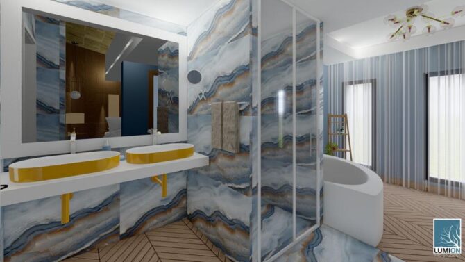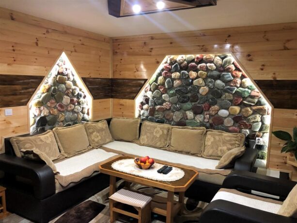 The exterior of the hotel is designed in an authentic mountain style, and the interior is combined with ethno and modern style.