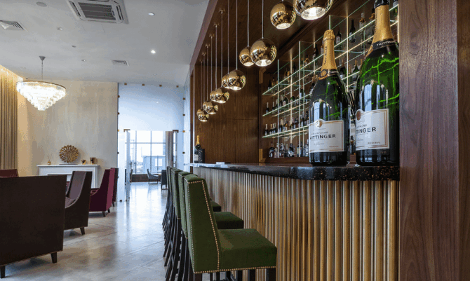During the construction of the hotel, they conceived a panoramic restaurant with a bar, and so it turned out. Through the huge windows, guests can admire the waters of the Gulf of Finland, the park and modern high-rise buildings.