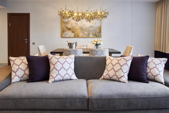 The choice is for those who are used to space, even with single living. But, of course, here you can accommodate a large company: 2 large bedrooms, a dressing room, 2 baths with all accessories, a living room with a kitchen. All this is located on 120 sq. m, you can not imagine a more luxurious room.