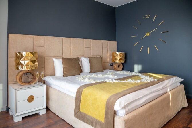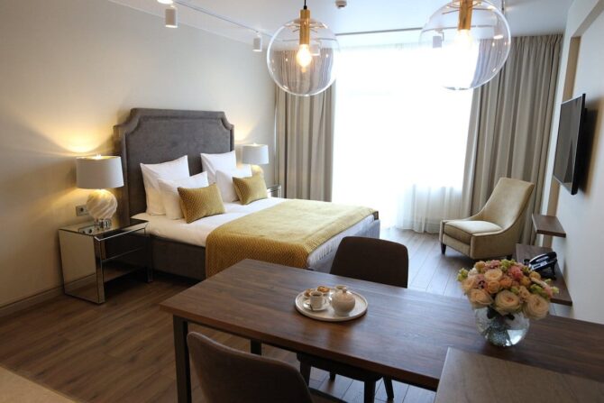 The room rate includes the following services: satellite TV, wireless Internet, mini – bar, safe.