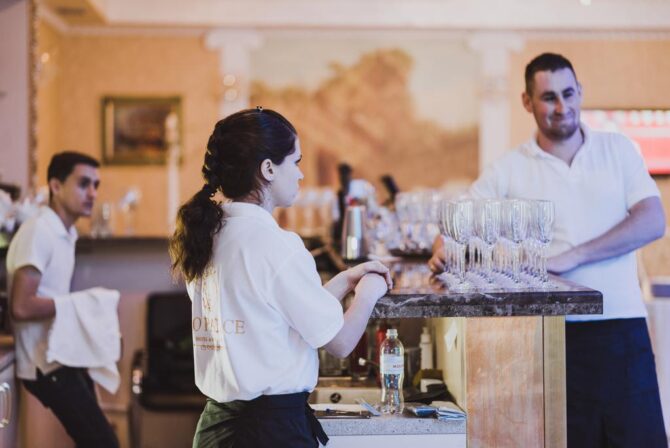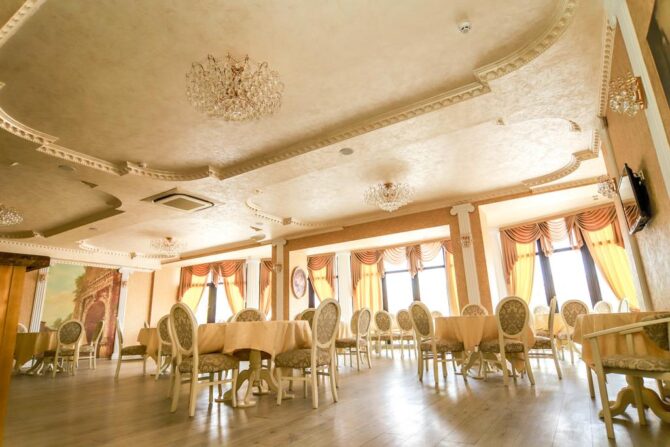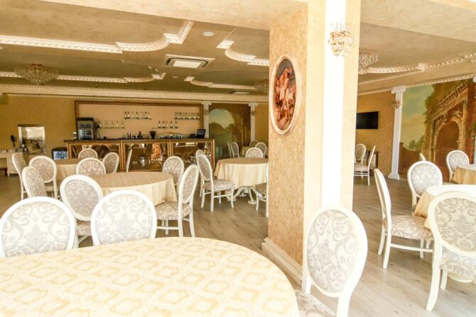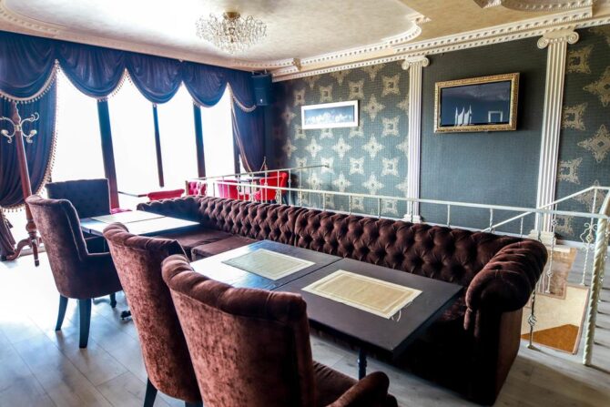 The spacious hall of the restaurant is designed for 100 seats, another 5 tables for four are located on the outdoor terrace. The restaurant’s menu serves European cuisine. Separately developed grill menu. The bar offers a large selection of alcoholic and non-alcoholic drinks. On weekends, in the evenings, musicians, artists perform here, entertainment programs are held.
