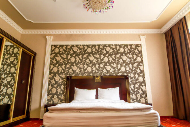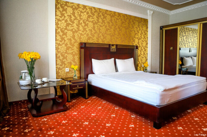 - Standard (23 sq. m) – a spacious one-room suite for 2 people. There is a large double bed, a wardrobe, a coffee table with a tea station, a separate table for cosmetic accessories with a large mirror. For additional comfort, a soft chair is provided.