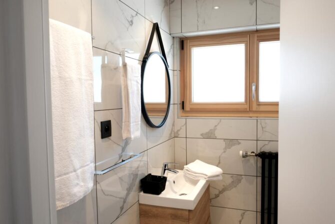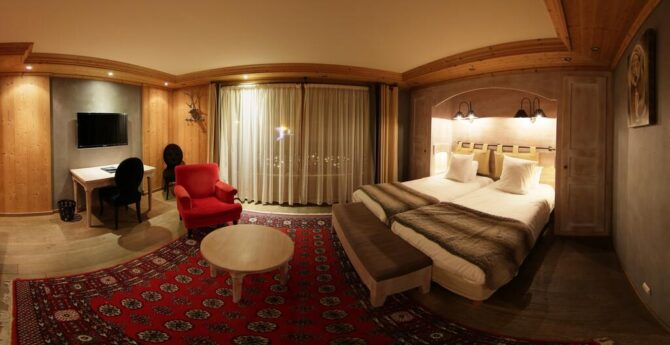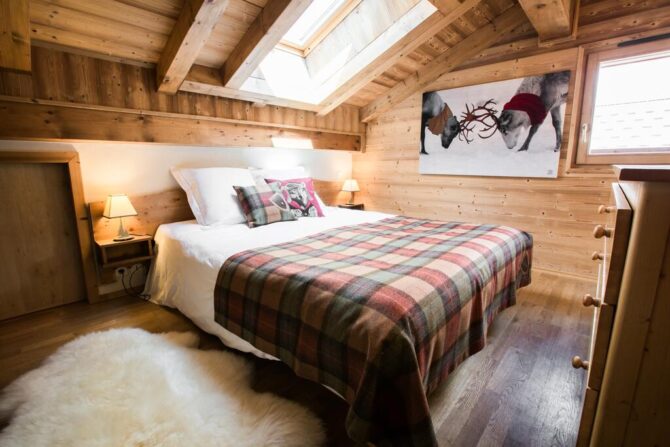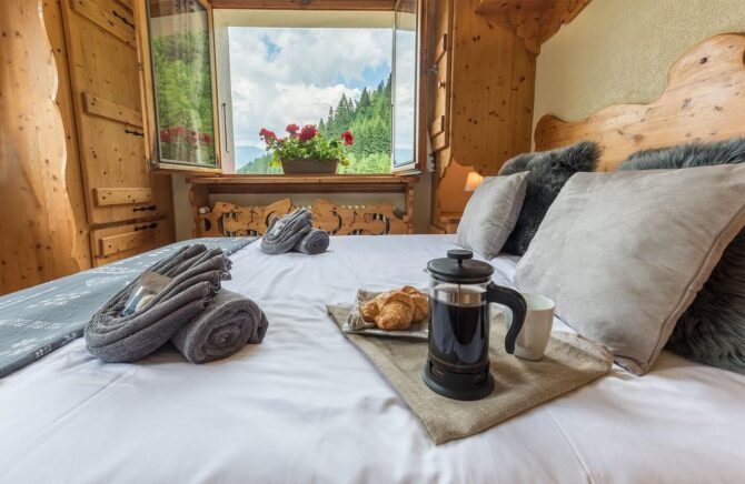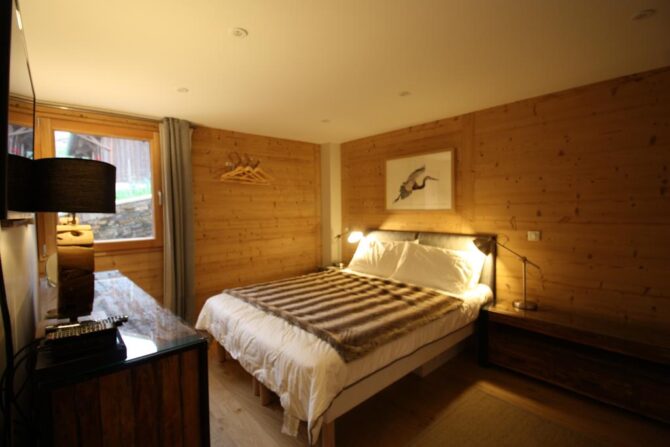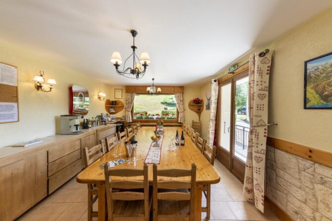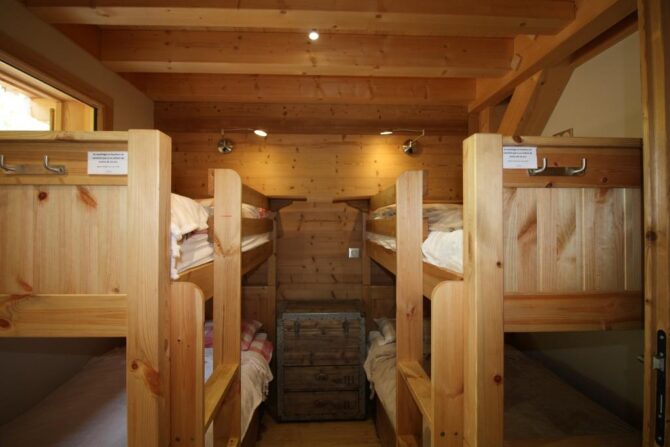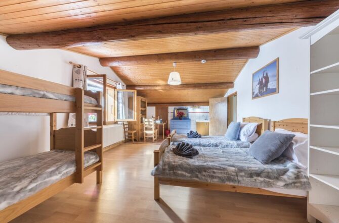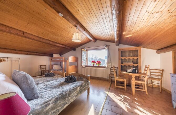 The chalet has five double and two family rooms that can accommodate up to 4 people, for a total of up to eighteen guests. All rooms are decorated with pine board in traditional Savoyard motifs.