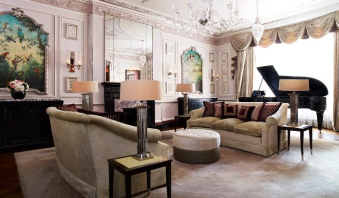One of the most interesting hotel interiors can be found in the penthouse of London’s Connaught Hotel on May Fayre. The penthouse is rented for several months. There is no feeling of formalism in its space, which is often inherent even in the most luxurious rooms. On the contrary, the impression is that you find yourself in the apartment of your good friend, who a few minutes ago went out for a bottle of wine to celebrate a meeting. Even the fire in the marble fireplace in the living room was still burning.