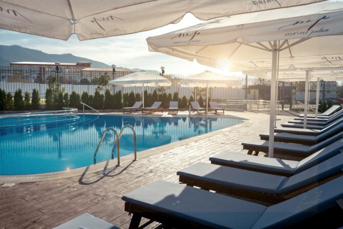 People come to Gelendzhik for the sea, so the Marine Palace hotel is not too concerned with the leisure of guests: most return to the room only for the night. Cheerful companies can spend the daytime at the hotel pool – very decent, heated and clean, but there is little space, and there are no more than twenty sun loungers.