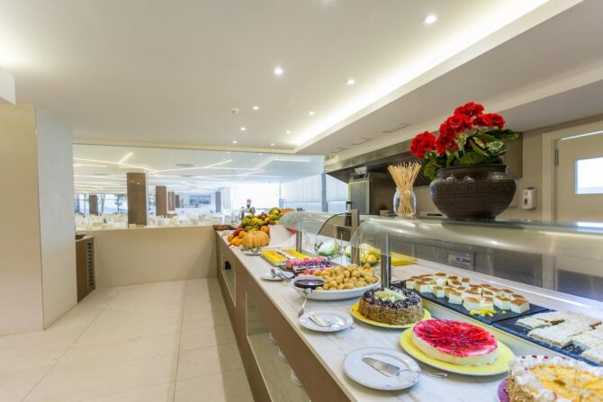 The hotel’s restaurant serves only breakfasts and dinners. Food receptions take place in the style of a buffet. There is a wide variety of international dishes. A wide selection of meat plates, different dishes from eggs, cereals, vegetables, fruits, a bright assortment of desserts and pastries. Alcoholic beverages go for a fee, but kava and sangria are free.