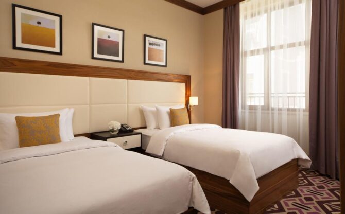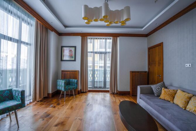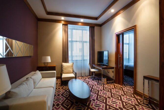 - Superior – a spacious room with one double or two single beds, designed for 2-3 guests. In addition to the bedroom, there is a seating area with a large TV, sofa, armchair and coffee table.
