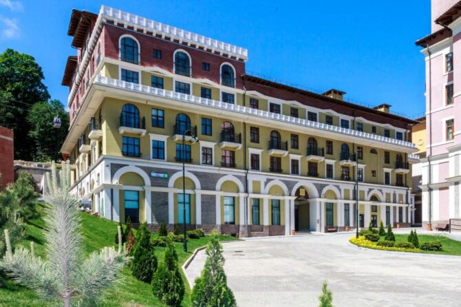 Pavenpik Krasnaya Polyana became the first mountain hotel of the Swiss brand. By the way, in Russia there were no representatives of the Mövenpick family until 2019. The building of the five-star hotel consists of five floors. The windows of the rooms overlook both the mountain peaks and the courtyard in the form of an atrium. On the ground floor there is a gourmet restaurant. The hotel has a thermal SPA-zone with steam rooms, an indoor pool and gyms. The territory is under round-the-clock surveillance.