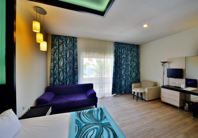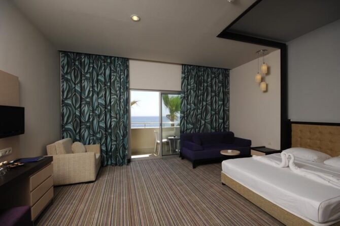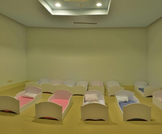 For guests, the rooms are located in the main building – a six-story building of unusual shape. In addition to it, there are three more three-storey villas. Apartments of different categories with a maximum of six people. A total of 555 rooms with an area of 40 m2. Standard rooms can accommodate up to four people. They consist of a bedroom, a bathroom and a balcony. Two single beds or one double bed, with the possibility of installing an additional two beds for children.
