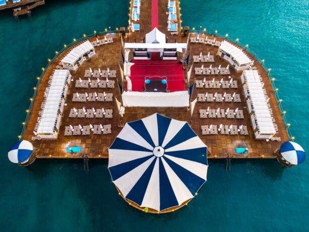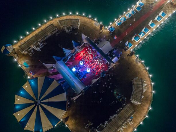 The unusual pier is beautifully lit in the evening. Along it there are lanterns and comfortable poufs, benches, so that you can enjoy the beautiful view of the sunset. Nearby there are mountains, which also offer a gorgeous view. On the pier there are also sunbeds and umbrellas, so in the daytime you can sunbathe here. There is also a bar, which with its musical accompaniment adds to the atmosphere of romance.
