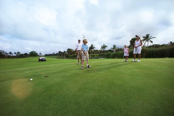 There is a separate Deluxe Golf Class overlooking the mini-golf course. It has two bedrooms, so can accommodate two couples or one married couple with children. The Family Duplexes also have views of the golf course, but they are duplexes, with two bathrooms.