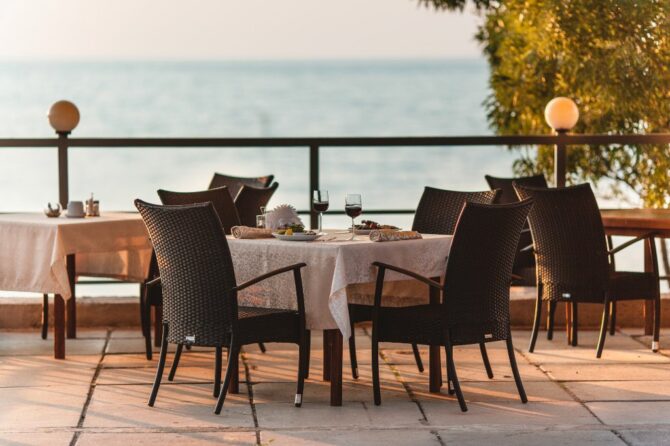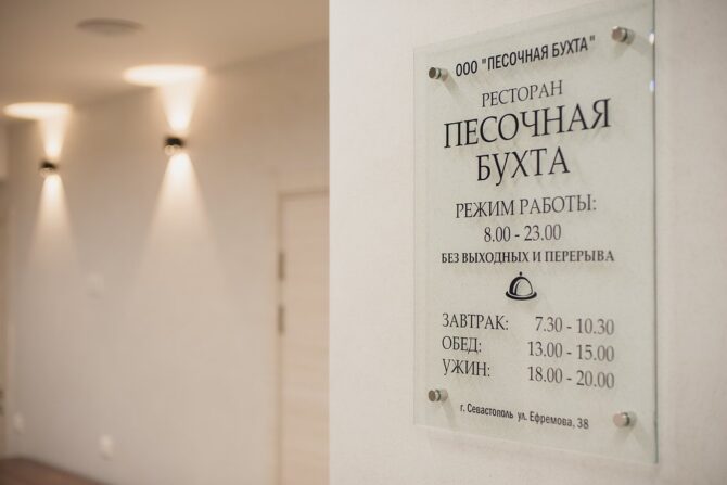 Meals are organized by the main restaurant “Sand Bay”. It is divided into two dining areas. One serves breakfast, lunch and dinner for guests who have purchased a guesthouse. The other part serves guests on the menu. The rooms are decorated with panoramic windows. They offer sea views. There is an open terrace from which you can see Chersonesos. The menu offers dishes of Russian and European cuisine. The wine list presents the products of the Crimean wine cellars. The bar card offers a large selection of cocktails and soft drinks.