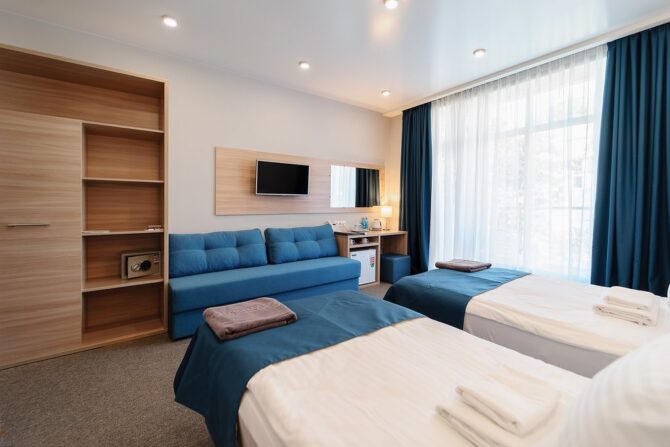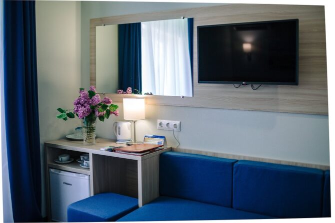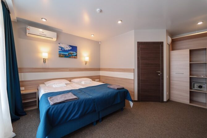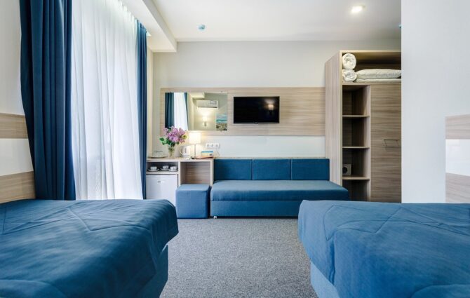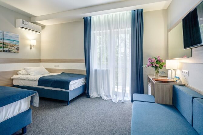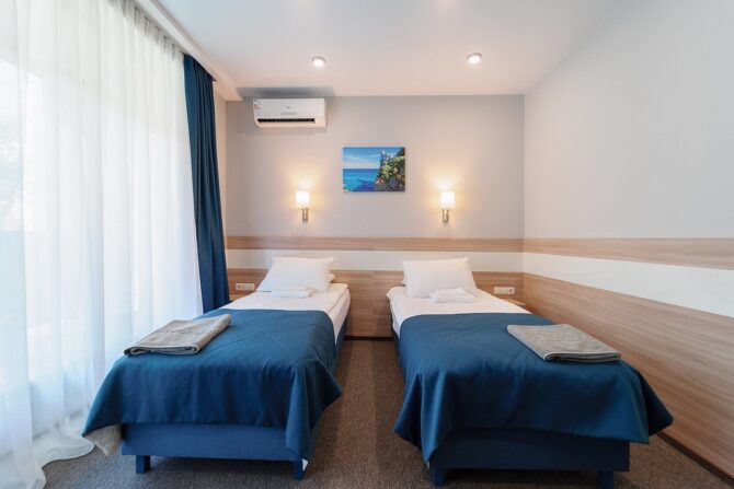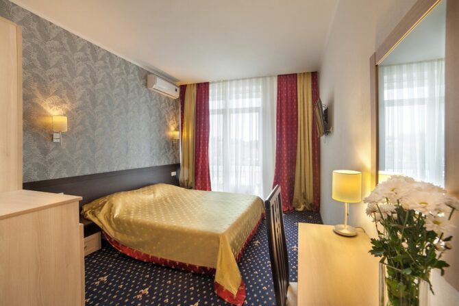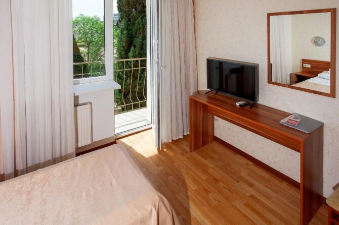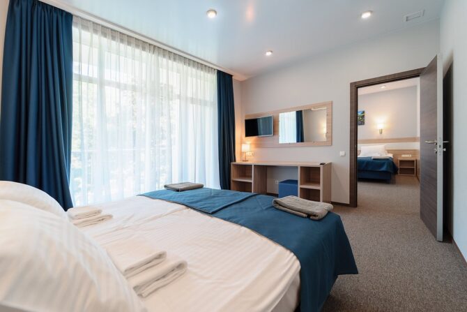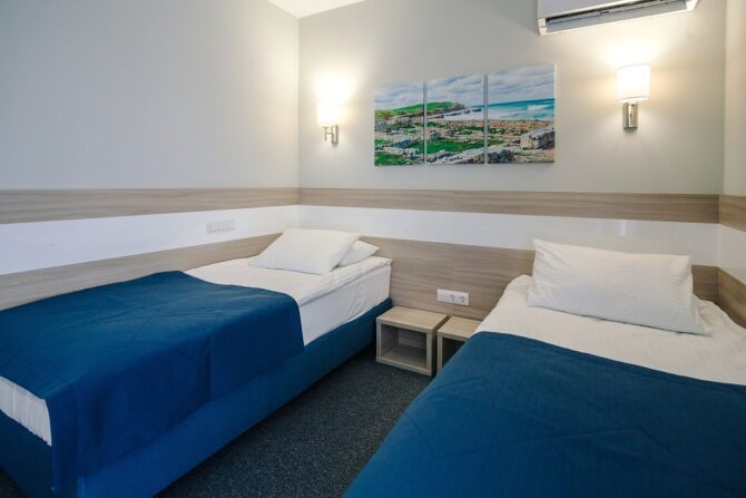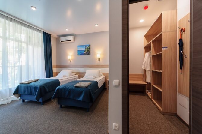 - Improved two-room standard (25 sq. m.). All rooms of this category with balconies, even located on the 1st floor. Comfortable accommodation for 3 people is possible. In a large room there is a double bed, in a small room – a single bed. A good option for parents with an adult child.