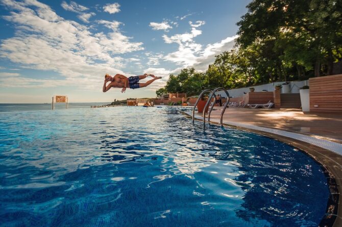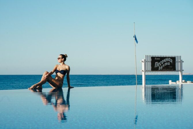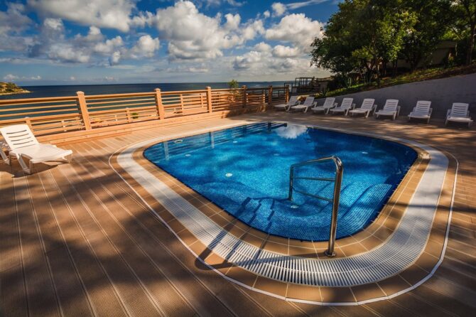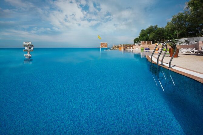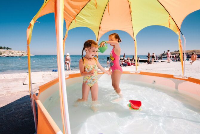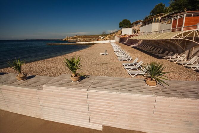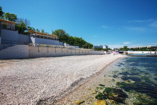 For adults and children there are 2 heated salt water pools. They are open daily in the summer season (from May 1 to October 30) from 08.30 to 19.30. In November, they work depending on the weather. The edge of a large pool visually merges with the sea surface. Thanks to the heating system, the swimming season here begins earlier than everyone else’s – from May 1.