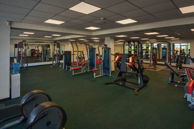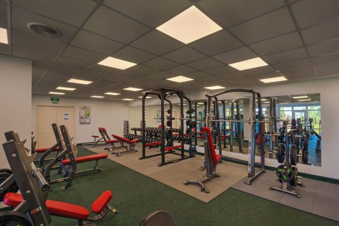 Sports enthusiasts love the local fitness room. It is equipped with modern simulators, both strength and cardio. There are also dumbbells, barbells, punching bags, steppers, free weight zone. Professional instructors work in the hall, ready at any time to help.