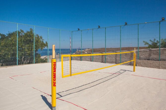 To accommodate guests built 4 comfortable hotel buildings. Each of them is equipped with rooms of different comfort levels. Each building is named after a hero of ancient Greek myths. The rooms are equipped with bathrooms, bottled water, mini-refrigerator, tea station, internal telephone for communication with the reception desk. Split systems are available in every room. The doors are closed with electronic locks. Wi-Fi is available throughout the property, including the beach area.