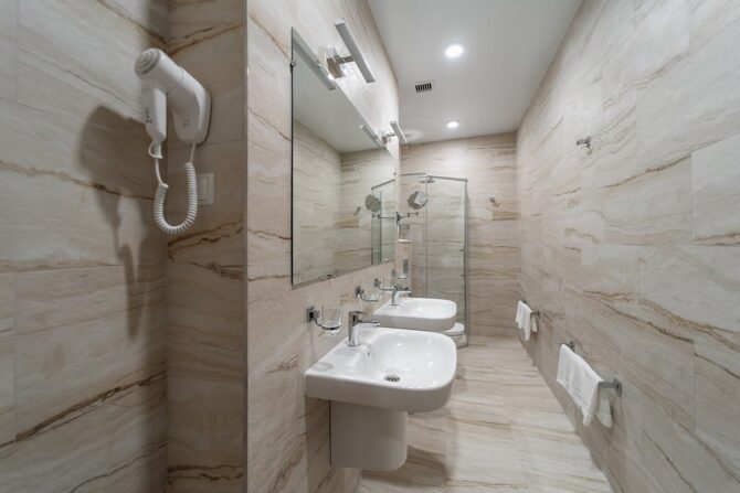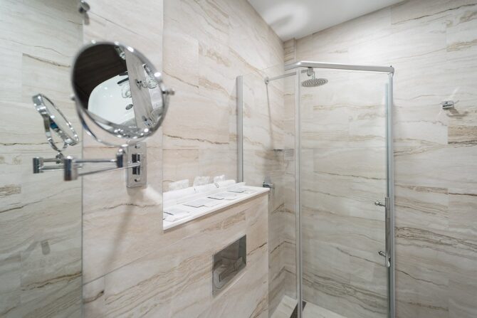 - Junior suite (25 sq. m)) with a double bed and a sofa bed. The room can comfortably accommodate up to 4 people. Instead of a shower cabin, a bath with a watering can be installed. 2 rooms of this category are located on the 1st floor, so they do not have balconies.