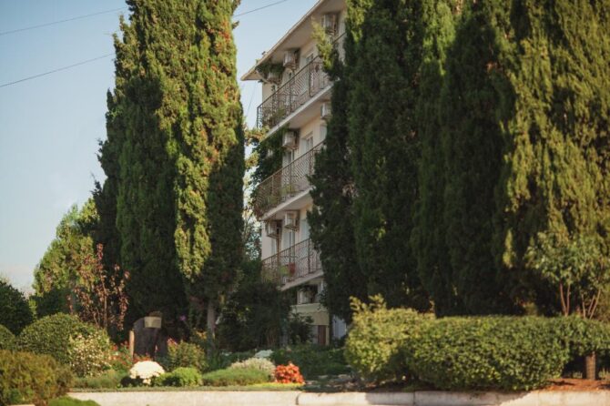 The hotel is located near the archaeological site – excavations of the ancient Greek city of Chersonesos. The object is under the protection of the state and the international organization UNESCO. According to the rules for the preservation of the cultural heritage of the world, traffic is restricted in such areas. The nearest bus stop is a 10-minute leisurely walk to the hotel. But it will pass through the alleys framed by relic plants.