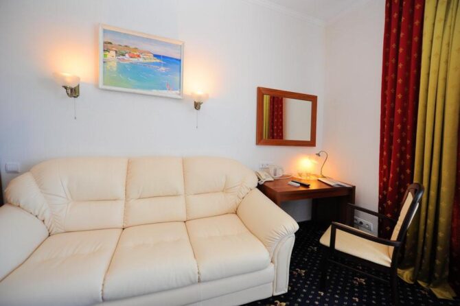 - Superior two-room suite (30 sq. m.) is able to accommodate a company or family of up to 6 people. The rooms are not passable, there is a cozy sofa for rest, a desk for work.