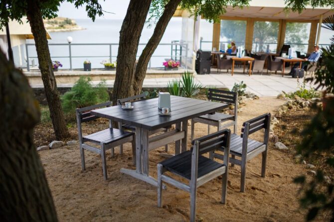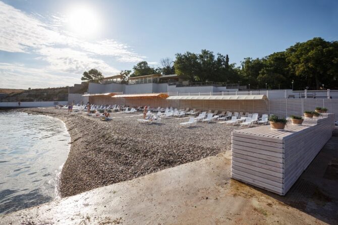 The private beach stretches for 150 meters along the coastline. It is awarded the Blue Flag for the purity of the water and territory. The surface is pebbly. On the shore there are sun loungers, umbrellas, wooden paths, shower cabins with fresh water and a modern toilet. A rescue station is nearby. Hotel staff provide vacationers with beach towels, recreational services.