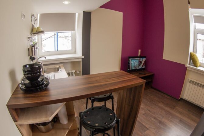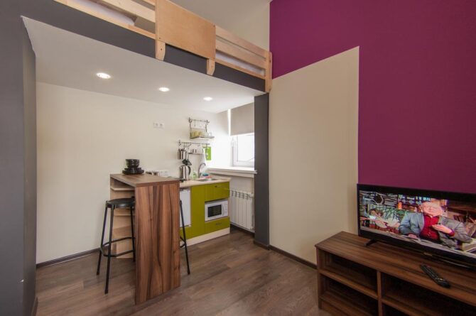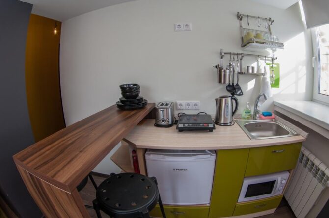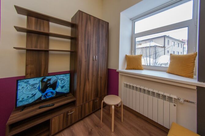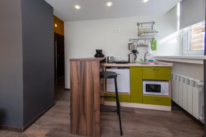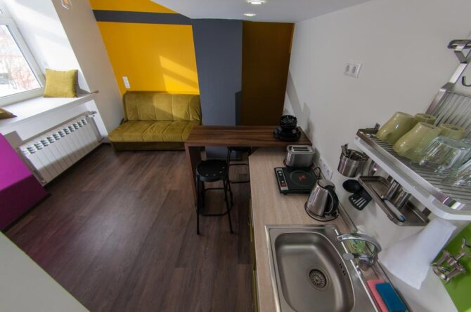 The owners decided to create comfortable conditions for skiers without unnecessary frills – sleeping places, kitchenettes, a bathroom, a warm room for storing equipment. For sports, this is more than enough. So that guests do not waste time on a trip to the slopes, it was decided to build the building next to the lift. The journey from the airport takes 30 minutes by taxi or 40 minutes by public transport. The hotel provides car owners with free parking spaces.