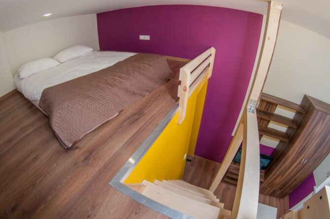 The hotel is small, it has only 17 rooms. Up to 50 people can live here at the same time. The rooms are duplex. On the first level there are kitchen, dining and guest areas. On the second – a bedroom. Each room has its own bathroom, kitchenette with the necessary set of household appliances and utensils, TV. Wi-Fi is available throughout the property and in all rooms. The design is modern, bright, we can say that festive.