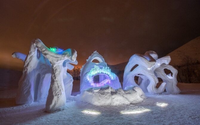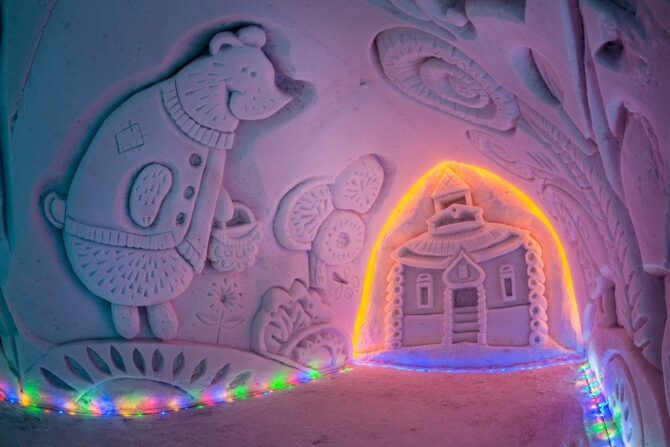 Construction begins as soon as the first snow falls. Artists, sculptors and just amateur sculptors from all over the world come here. Objects are created on a given theme, and the grand opening is scheduled for New Year’s Eve. At the end of January, the festival “Snow Ice” is held. The event lasts a week. Its culmination is the show “Mad Saw”. Sculptors unite in teams of 2 people and in front of the audience for an hour and a half create another ice masterpiece. The park of snow sculptures pleases tourists until the end of winter.