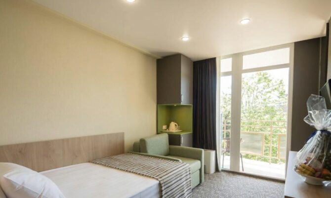 - An amazing double room with a total area of 27.3 square meters has one double bed and an extra bed – an armchair that can easily decompose into a sleeping bed. The room has all the necessary conditions for a memorable holiday. Vacationers can have a good time on the balcony, admiring the sea, the bathing area and the beach.