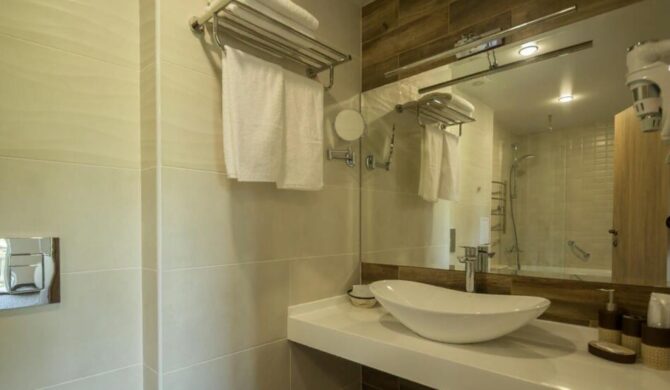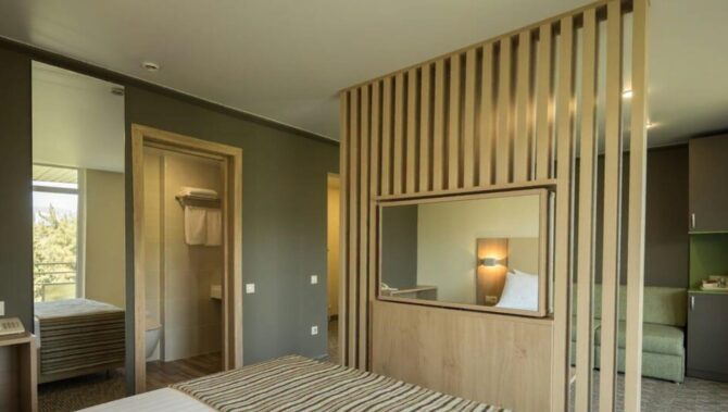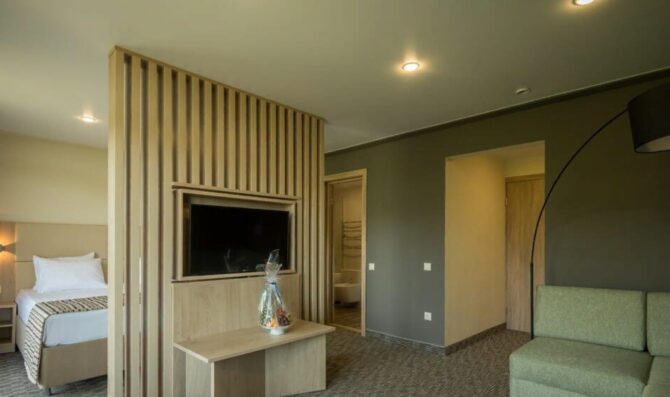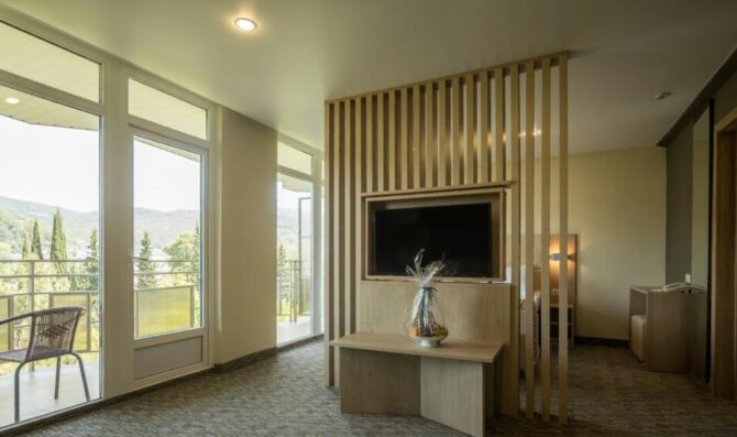 - Comfortable two-room double suite with a total area of 43 sq. m. is equipped with a double bed and an extra bed – a sofa, which can be easily decomposed into a bed. The room also has two bathrooms. The brilliant decoration of the room offers a comfortable and pleasant stay for our guests. Vacationers can spend a pleasant time on the balcony, sitting on comfortable and modern furniture, and admiring the magnificent surrounding landscapes.