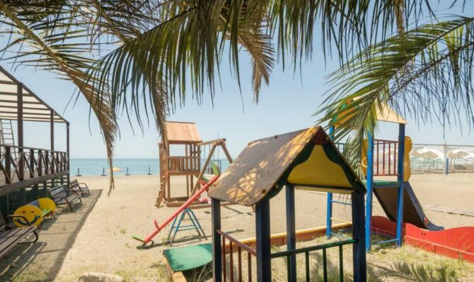 On the beach there is a beautiful volleyball court, as well as an outdoor sports ground with simulators. For the youngest vacationers there is a play area with a sandpit and swings, slides and attractions.