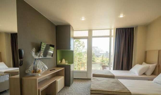 The pension is located in a picturesque corner near the shore. Warm sea, mountains and a perfectly mild climate predispose to a cozy and carefree holiday of our guests. “Burgas” has two magnificent and modern seven-storey buildings and two small-storey buildings. In each building there are two and one-room suites, equipped with everything necessary for a cozy and memorable holiday, including air conditioning systems, TVs, refrigerators, telephones, as well as furnished balconies and loggias. Our pension provides guests with easy access to the Global Network via free WiFi.