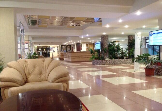 - The lobby bar is located in the lobby of the first building. Here, in a cozy atmosphere, you can sit with a cup of coffee and various desserts. The bar is decorated in a beautiful classic style.