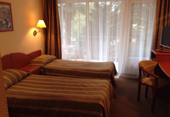 - Double room with a total area of 18 square meters has two comfortable single beds, which, if desired, can be combined into one double bed. There is also an extra bed – an armchair, which can be easily laid out in a bed. The excellent entourage of the room sets our guests up for an amazing and unforgettable stay. In the evenings, vacationers can spend time on the balcony, admiring the magnificent surrounding views. To do this, they have at their disposal comfortable modern furniture.