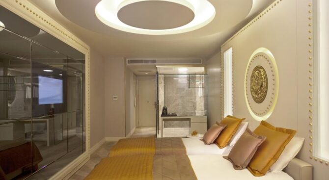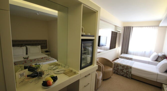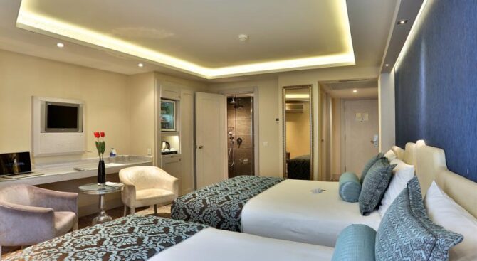 Among the advantages of this hotel is worth noting its chic decoration. In addition, you can use the “buffet” for breakfast. The menu of the restaurant is very diverse – there are dishes from international and Turkish cuisine. You will be amazed by the stylish decoration of the bar, which is decorated with paintings in the style of frescoes. In the hotel you can take advantage of round-the-clock delivery of food and drinks to the rooms – this is another advantage of the hotel.