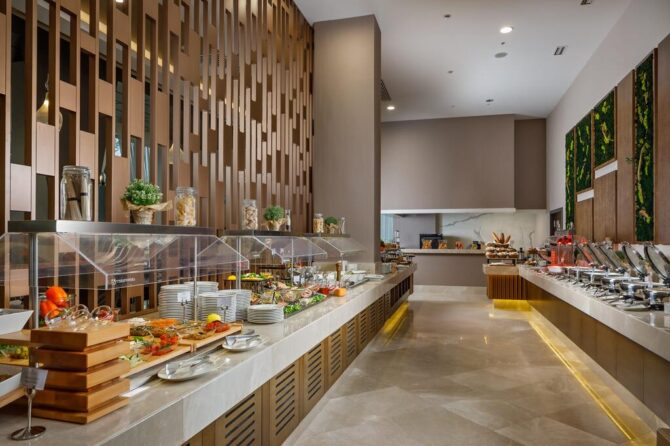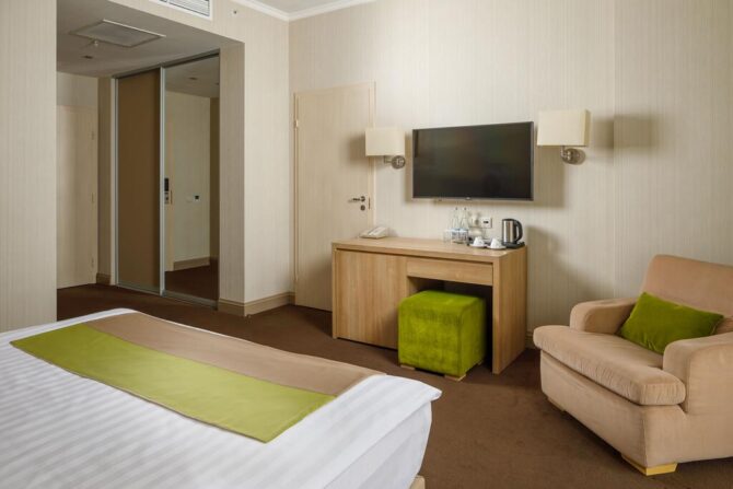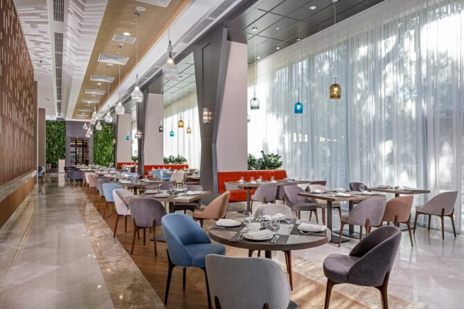 The business center is quite large in area and can accommodate more than 600 people. If necessary, you can divide the zone in such a way that you get a total of 6 halls. They can hold events of absolutely any level. Each hall has its own name. They differ in scale. The hotel’s business centre offers a variety of meetings. The meeting rooms have all the necessary equipment for successful negotiations. There are projectors. Our employees will be able to adjust the necessary lighting and sound. Since the size of the rooms is different, each room will have its own type of activity. For example, in the smallest meeting rooms, you can hold meetings or business meetings that do not involve a huge number of employees.