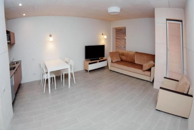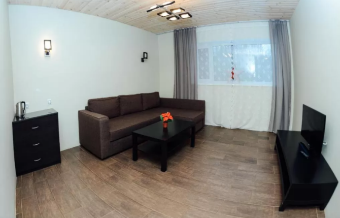 - Cottage category “Luxury” (25 sq. m) consists of two rooms. In one there is a bedroom, in the other there is a living room with a sofa.