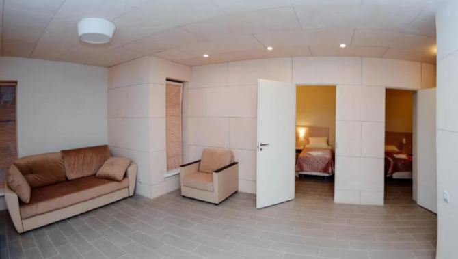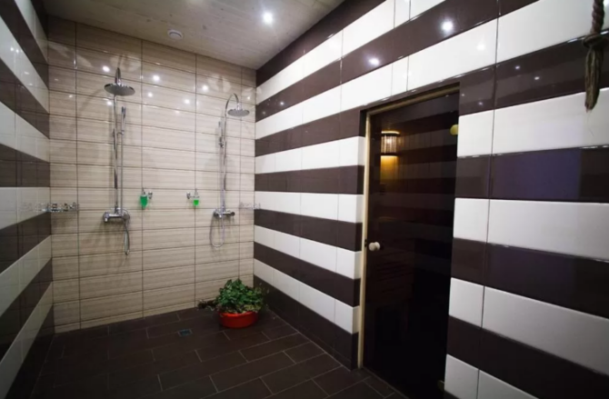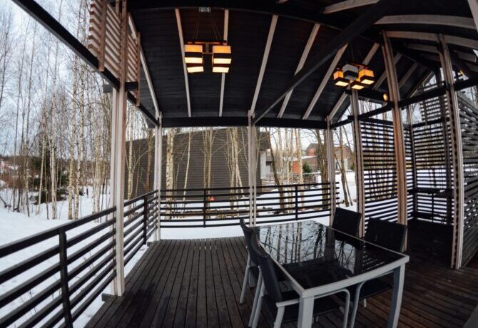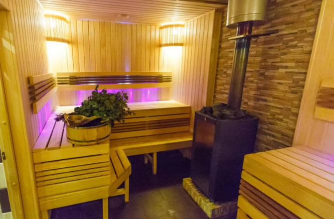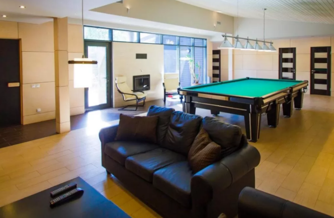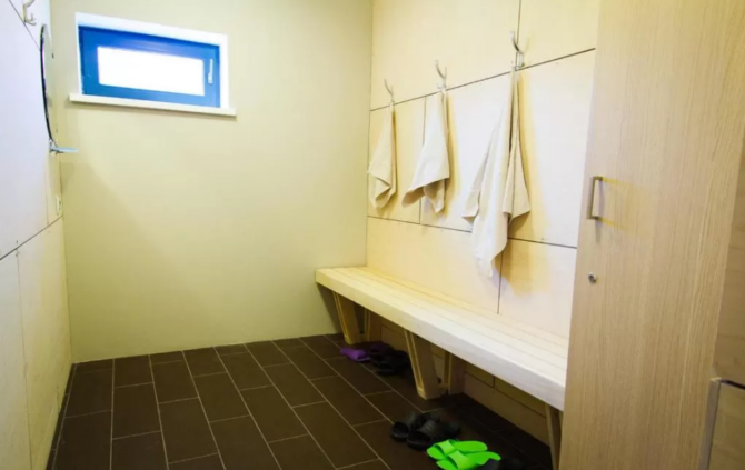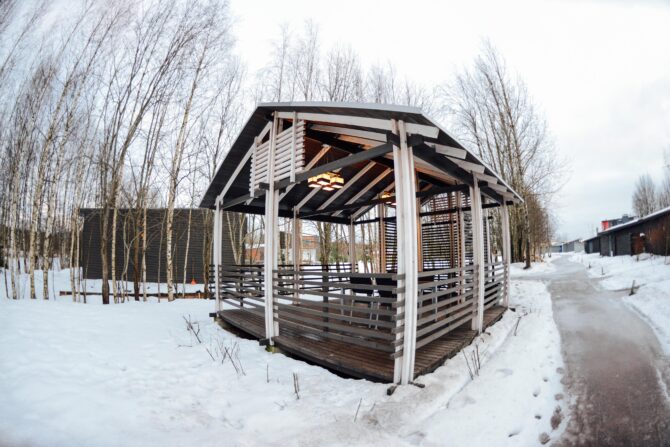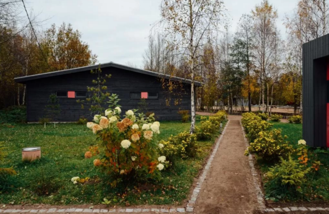 It offers a large bath complex with a sauna for 15 people. It is located in a separate house decorated in Scandinavian style. In front of the house there is a terrace with sun loungers for relaxation. Next to the steam room there is a room with billiards, a dining table, a kitchenette and a fireplace. Here guests like to relax on winter evenings. In summer, there is usually a terrace. The complex has living rooms. They are designed for those who come for the weekend to take a steam and walk around the neighborhood.