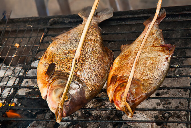 It is impossible to imagine a holiday in nature without kebabs. There are several mangal areas on site. Separate braziers with tables are installed near each house and cottage. The gazebos are electrified, so you can plan gatherings for the late evening. Skewers and lattices are provided free of charge. Coal, liquid for ignition guests usually bring with them. If you need to replenish the stocks of “combustible materials”, then a 15-minute drive from the recreation center there is a supermarket “Pyaterochka”, where there is always material available for kindling.